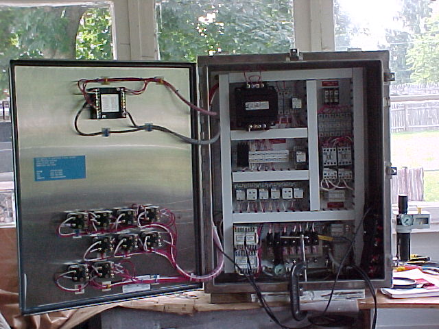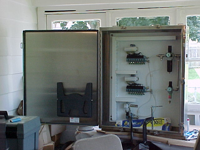 4 way pneumatic solenoid manifolds enclosed in a Nema 4x stainless steel enclosure. Panel was assembled for a food manufacturing facility per their engineering firm's design specifications.