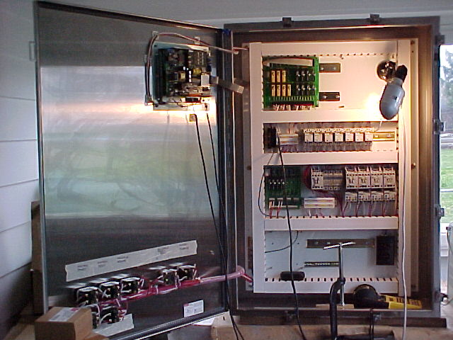 Design/build process H2O tempering system for food processing entity. System utilizes 1/4 Din temperature indicating PID loop controller with analog output to I/P transducer for steam valve flow control. Pump motor starters, H20 tank level controls, alarm indication(s) and horn inhibit. Draw enable interlock disables process H2O delivery if out of temperature tolerance or in low level alarm. |